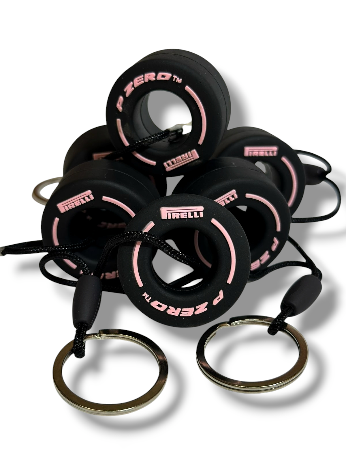 Llavero Neumático Rosa muestra una versión en miniatura de la llanta Pirelli, con todos los detalles que hacen que estas llantas sean fáciles de identificar en cualquier pista. Desde los colores característicos hasta los patrones únicos de la banda de rodadura, este llavero es un homenaje visual a la tecnología y la ingeniería que mueve a los monoplaza de F1.